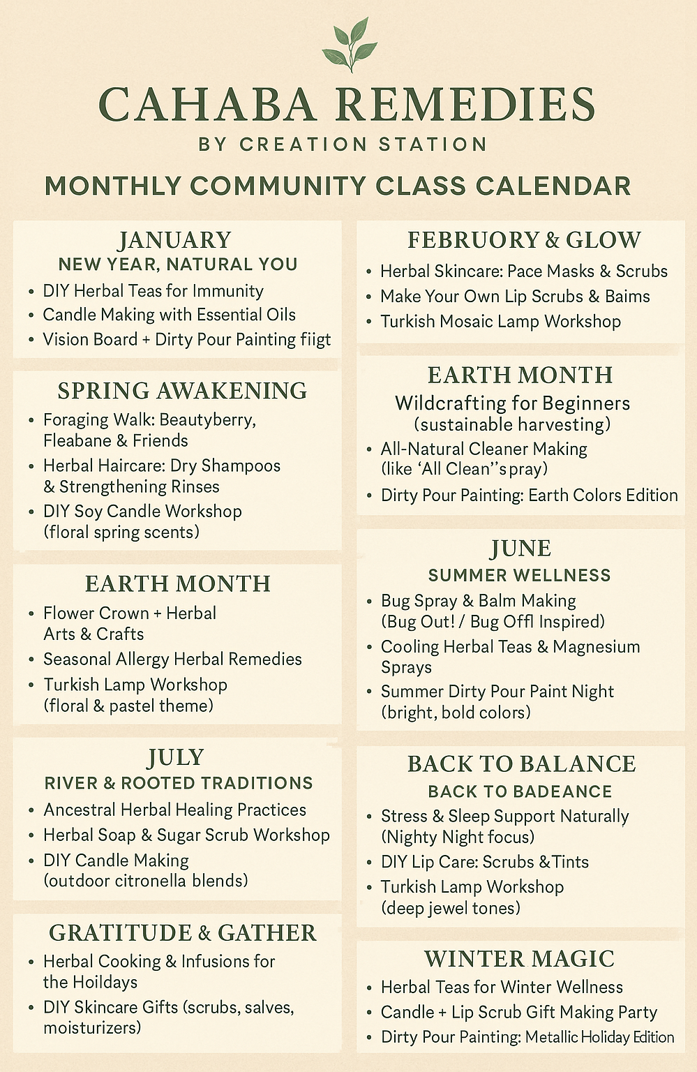 Each month we offer small, hands-on workshops (10–12 spots only!) for crafts, herbal remedies, and apothecary-inspired creations.